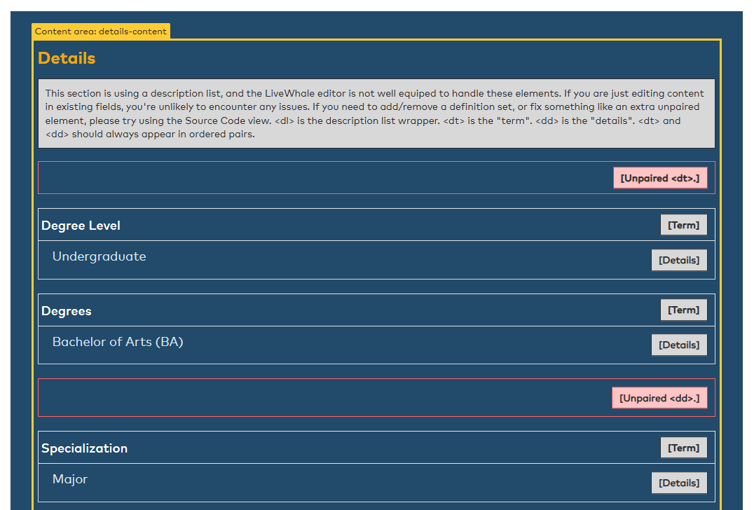 That said, we’re following advice to use description lists for content like this to support SEO and AI search, and I assume we (and others) may start using them more frequently. How frequently, I’m not sure, but it may be worth some attention so the LiveWhale editor can handle them well should they be used.